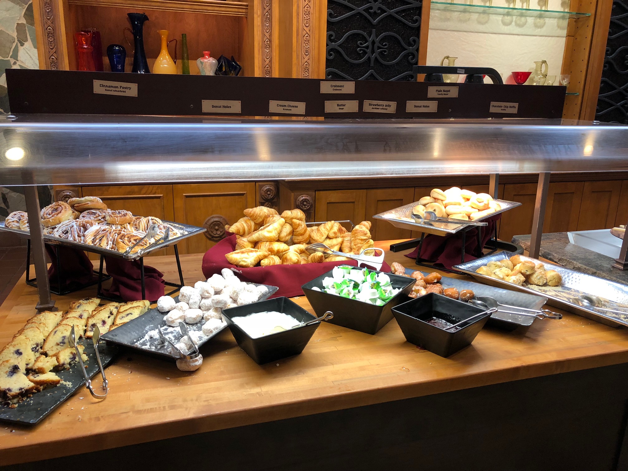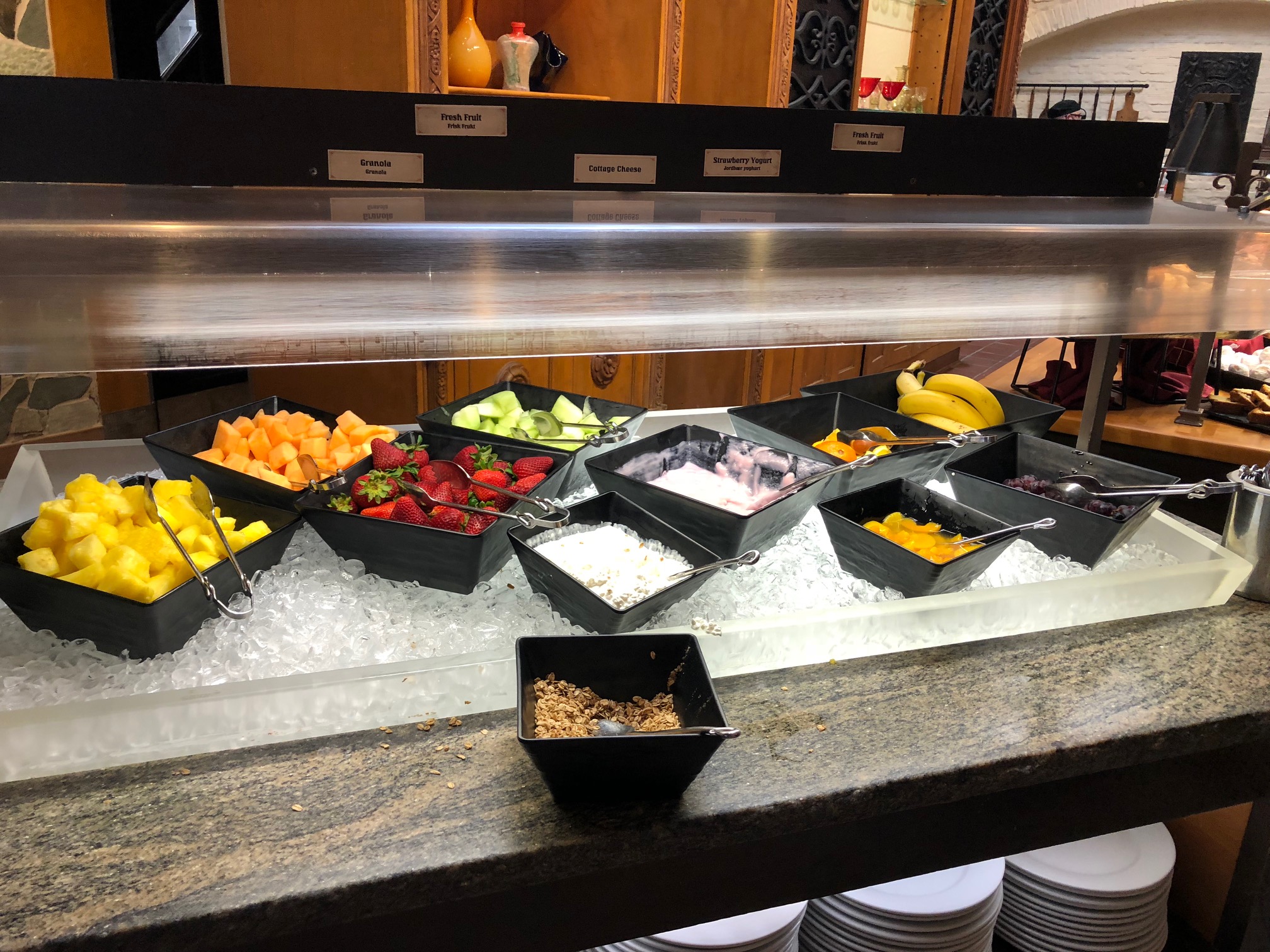 No café, uma parte da comida fica disponível num buffet, e a outra é entregue na sua mesa. No buffet, você vai encontrar: frutas, iogurte, cereal, uma variedade de pães, muffins, geléia, cream cheese, queijos, salmão (é, pois é… rs) , salame, frios em geral, manteiga, cebola, e uma coisa ou outra a mais.