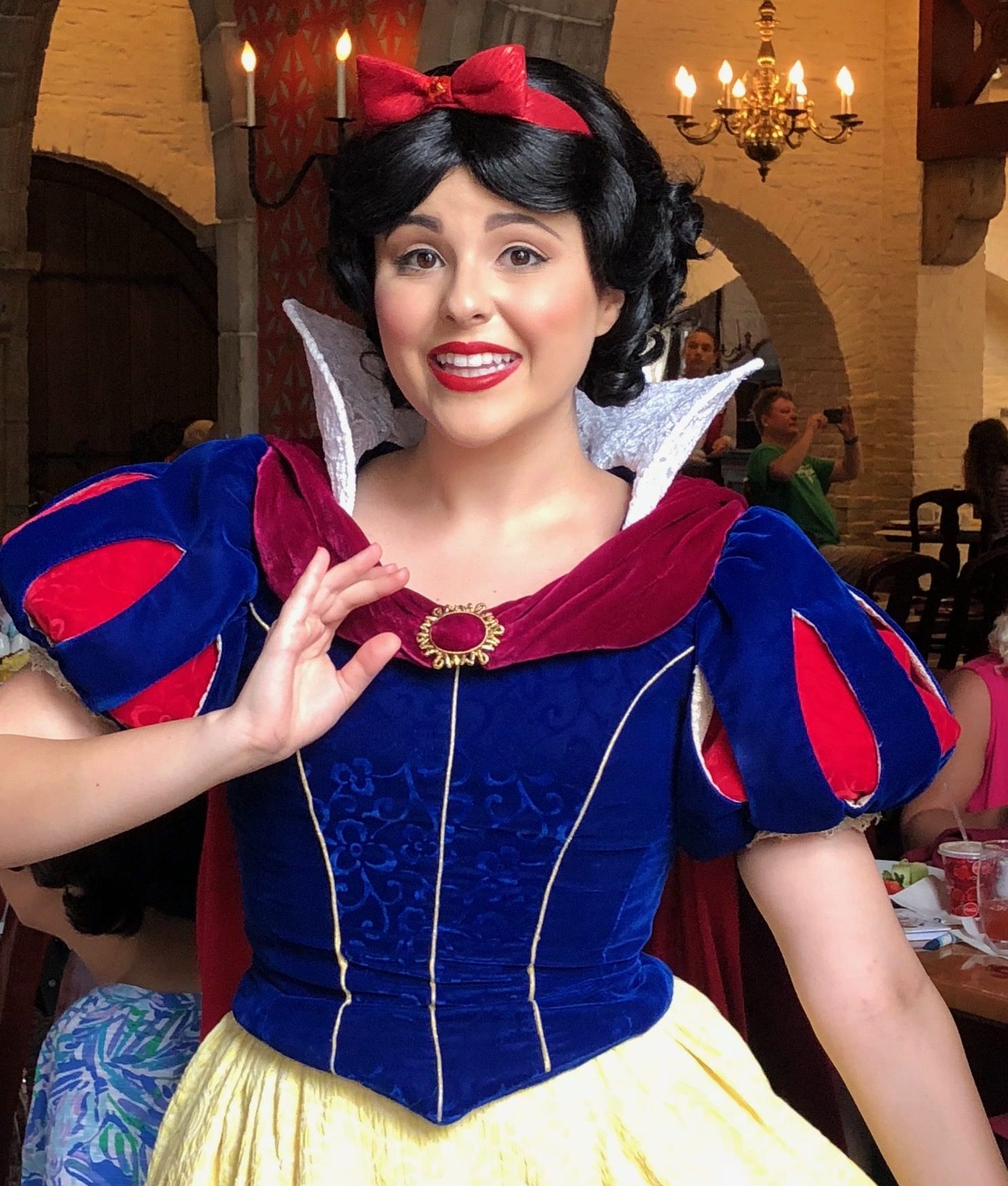 A Bela, inclusive, é a “princesa principal” do restaurante! É a que recepciona os convidados que chegam, e tem um lugar específico para tirar fotos com ela, com fotógrafo do Memory Maker também.