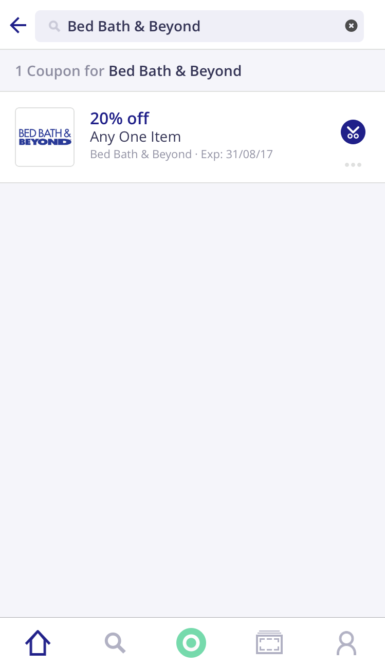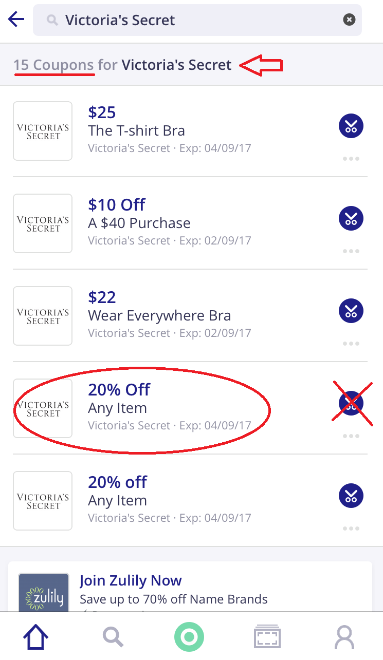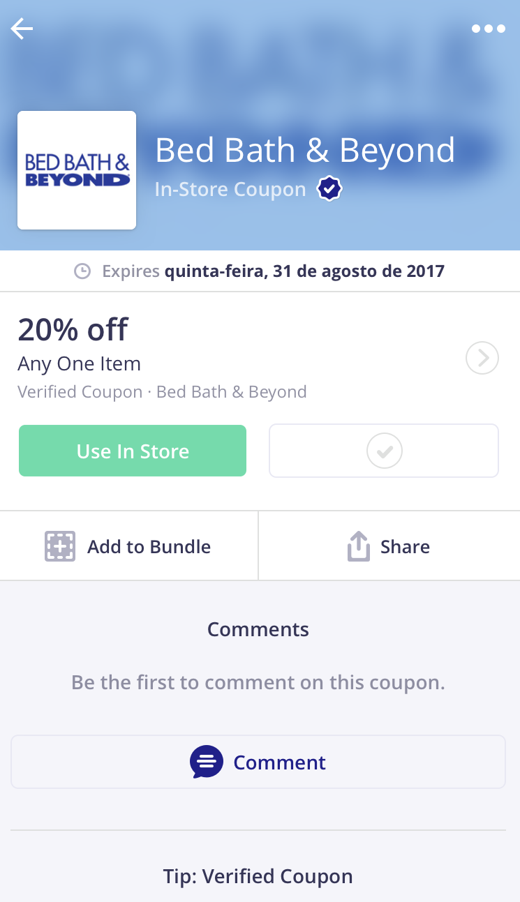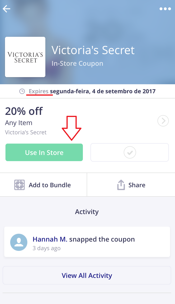 5- São duas maneiras de você usar o aplicativo: uma é você procurar os cupons quando já estiver na hora de pagar na loja, só pra ver se consegue algum desconto para a compra que você já iria fazer de qualquer jeito. Desta maneira, é só clicar no campo de busca, digitar o nome da loja, vê se aparece na lista, clicar nele, vê quais cupons são disponibilizados, escolher o que mais irá te favorecer; clicar nele (NÃO na tesourinha lateral); clicar em “use in store” e mostrar para o funcionário do caixa, na hora que for pagar. Simples assim! Os exemplos que usamos nas fotos abaixo, foram para as loja Victoria’s Secret e Bed Bath and Beyond.