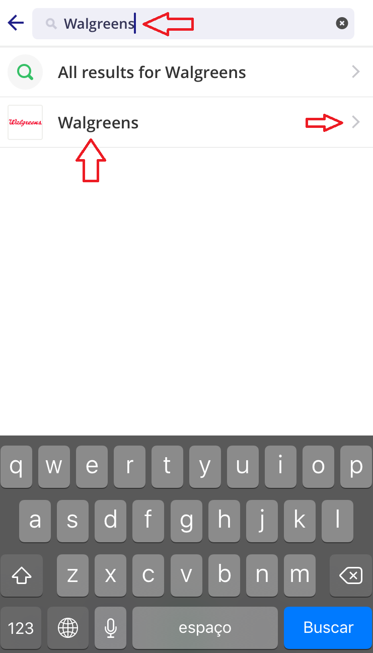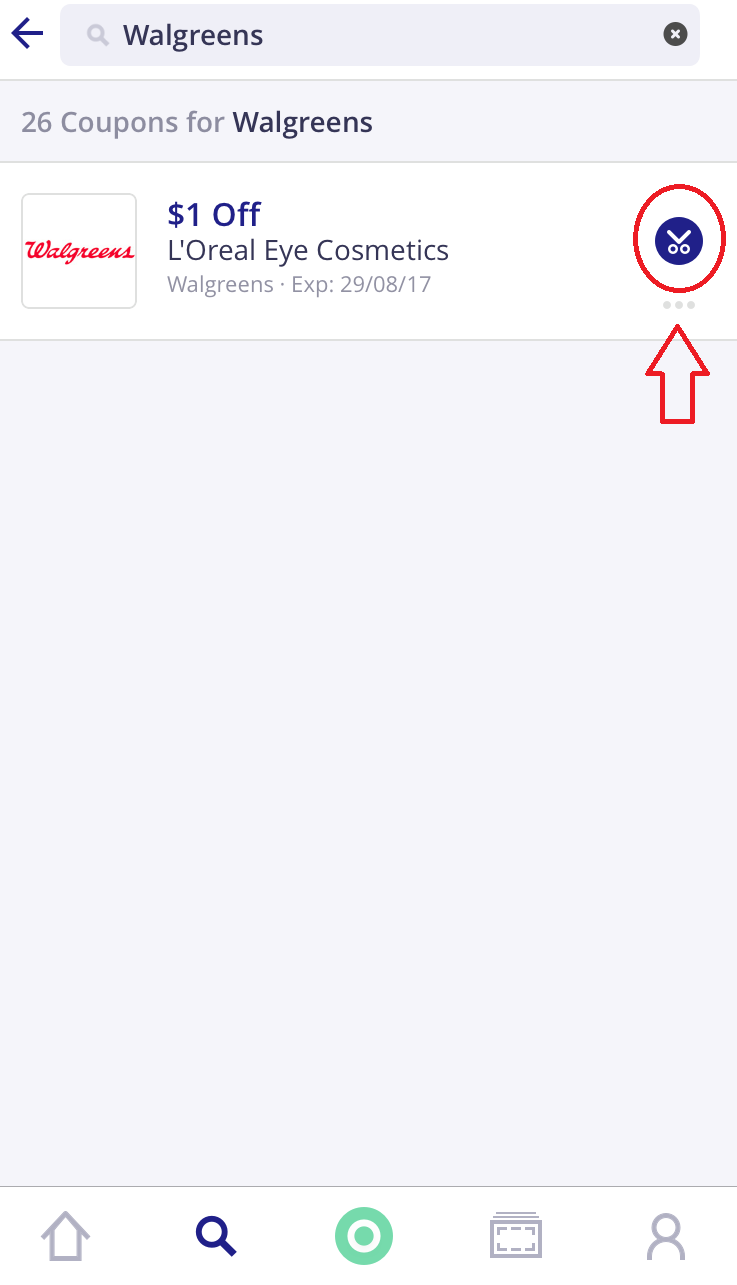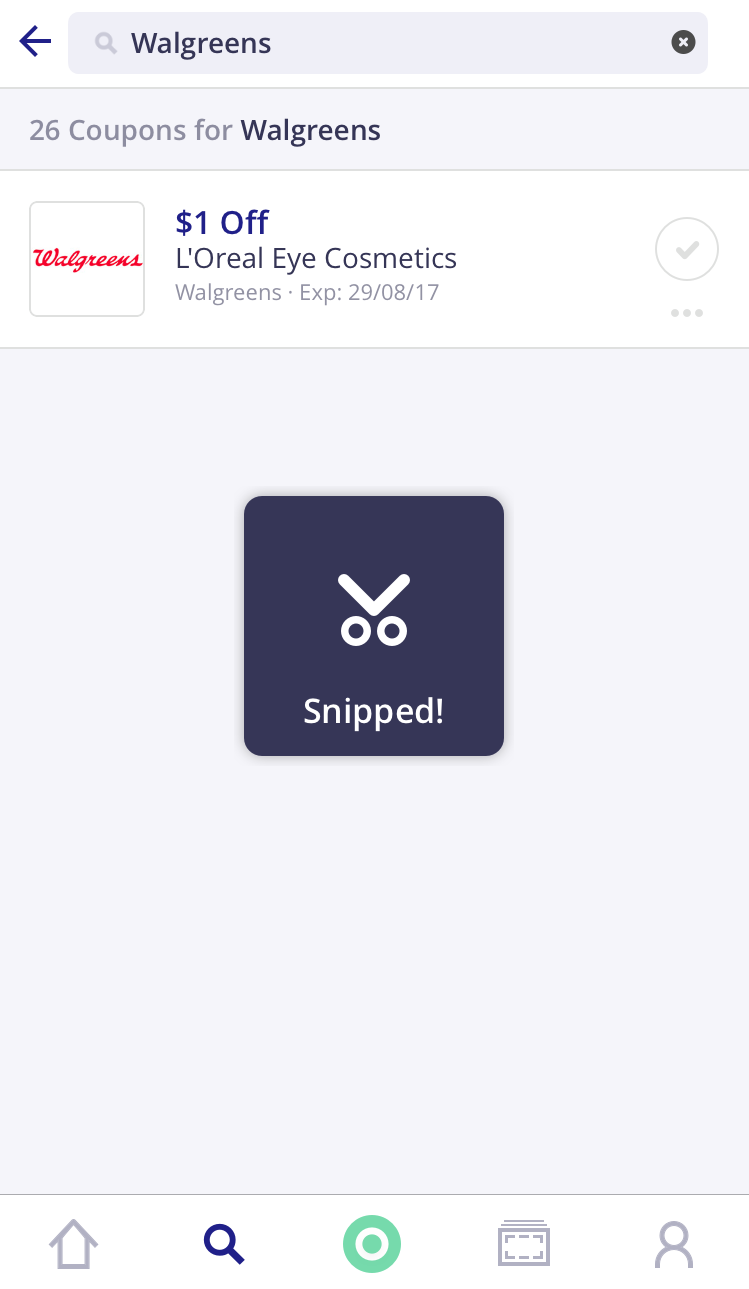 6- A segunda maneira de usá-lo, que eu considero bem mais eficiente já que sou “a louca dos planejamento”, é a seguinte: desde o Brasil, você já pode ir pesquisando pelos cupons das lojas que você já sabe que vai. Você irá fazer a busca da mesma maneira explicada acima. Clique no campo de busca, digite o nome de uma loja que você já sabe que irá; clique no nome dela na lista de lojas que aparecerá; veja os cupons que disponibilizaram; veja os que te interessa e, desta vez, clique na “tesourinha” que aparece na lateral de cada um deles. Quando você clicar nessa “tesourinha”, aparecerá na tela “snipped”. Significa que o cupom foi salvo na sua “wallet” (o símbolo que nos referimos lá no item 4 da explicação). Neste exemplo, utilizamos o Walgreens na busca de lojas.