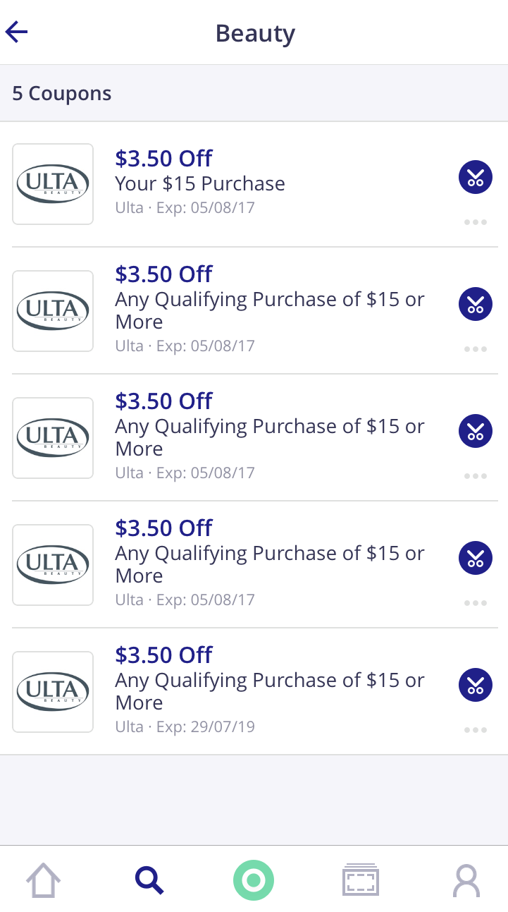 8- Outra maneira de fazer a busca de cupons é pela categoria que te interessa. Nesta tela aprecem todas as categorias disponíveis, e, ao clicar na do seu interesse, aparecerão os cupons disponíveis daquele segmento. Clicando na categoria “Beauty”, por exemplo, apareceu uma lista de cupons da loja Ulta.